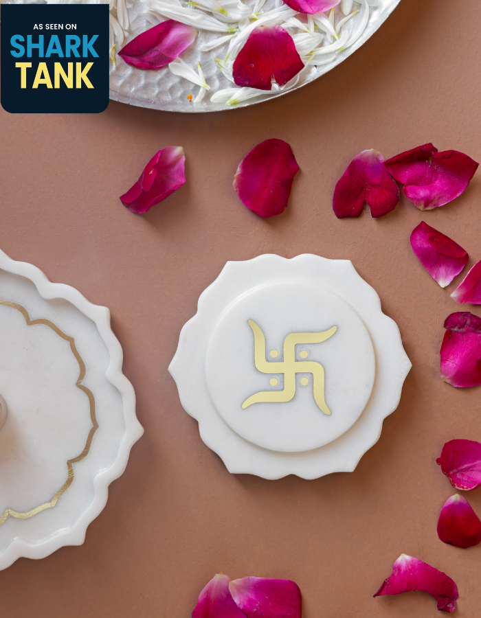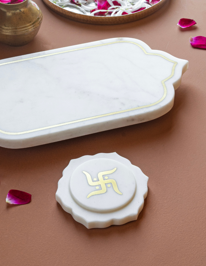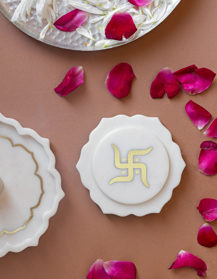 Marble Swastik for Mandir is a finely crafted piece made from elegant white marble with delicate brass inlay work that reflects timeless charm and spiritual significance. Designed to enhance your sacred space, it brings a sense of balance, positivity, and refined beauty. A perfect blend of tradition and craftsmanship, this piece adds a graceful and meaningful touch to your décor.
