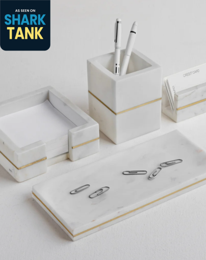 A beautiful stationary set having brass inlay handcrafted by our local artisans is a bespoke product to be kept in oneโs office and enhance the understated space . They are made up of natural marble extracted from mines in India and the inlay of brass stripes are handcrafted by our local artisans.