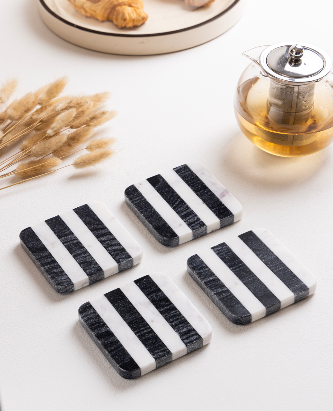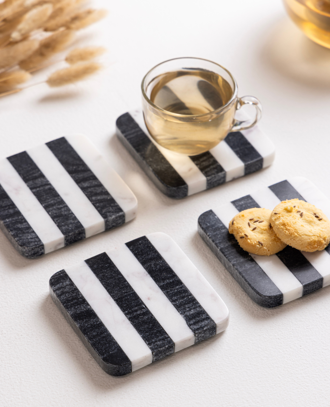 Enhance your dining and coffee table setup with this elegant Marble Black & White Coasters (Set of 4), crafted from premium-quality marble for a timeless and sophisticated look. Each coaster measures 4 x 4 inches, offering ample space to protect surfaces from stains, spills, and heat marks. Perfect for everyday use or special gatherings, these durable coasters combine functionality with style, adding a refined touch to any space.