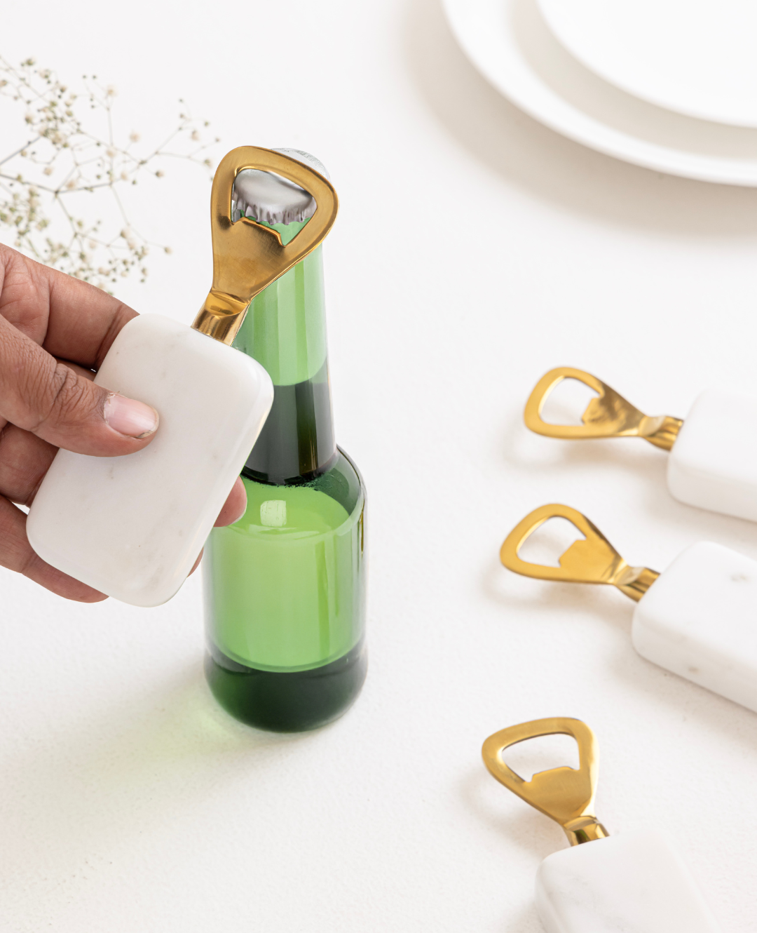 Add a touch of elegance to your bar and dining space with this premium Marble Bottle Opener, beautifully crafted from high-quality marble and brass. Measuring 5 x 2 x 0.75 inches, its sturdy and compact design offers a comfortable grip and smooth functionality. Perfect for everyday use or as a stylish table décor accessory, this durable piece blends utility with luxury, making it a refined addition to any modern setting.